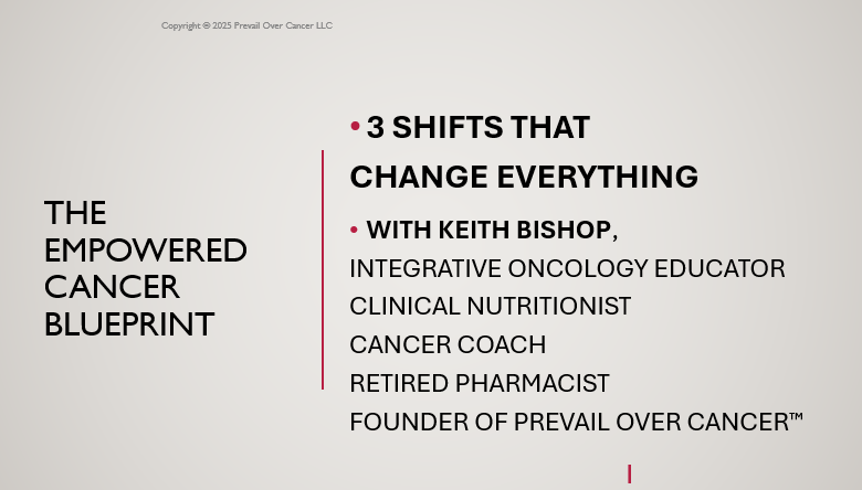 In this on‑demand workshop, you’ll learn how to support your terrain through Food, Lifestyle, Supplements, and how they interact with Medications — all translated into simple, practical actions you can start right away. Designed for people with cancer, survivors, caregivers, and clinicians, the Prevail Protocol™ brings clarity, confidence, and hope back into the healing process.